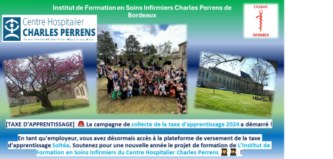 L’Institut de Formation en Soins Infirmiers (IFSI) de Charles Perrens a besoin de votre taxe d’apprentissage pour encore mieux former les futurs infirmier·e·s qui prendront soin de vous ou de vos proches demain.En soutenant l’IFSI de Charles Perrens, vous vous impliquez dans la formation de personnes qui ont choisi de s’engager au service de la santé des autres.Ainsi vous contribuerez directement à améliorer les conditions d’apprentissage des étudiants en soins infirmiers au travers de :
